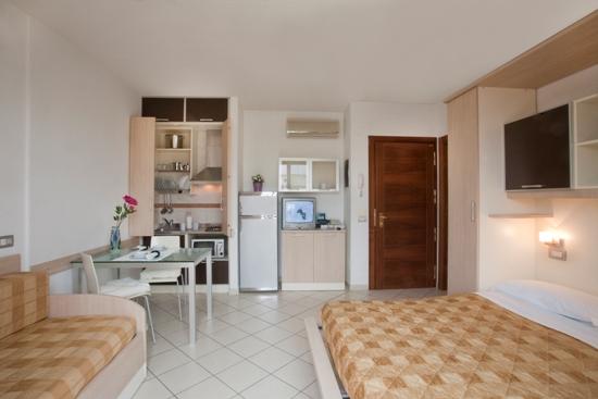 ubytování v pěkně vybavených bytech s kompletně zařízenou kuchyňskou linkou, plynovým sporákem, lednicí, vlastním sociálním zařízením, klimatizace, WiFi, TV-sat, trezor, balkon