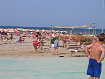 50 m, pláž jemně písčitá s pozvolným sestupem do moře. Nedaleko pláž 150 - nepřelidněná organizovaná pláž 150, sousedící s volnou pláží, díky které nejsou klienti obklopeni slunečníky z obou stran, ale naopak na jižní straně je volný výhled až na Gabicce Mare. Na pláži krásně vybavený dětský koutek