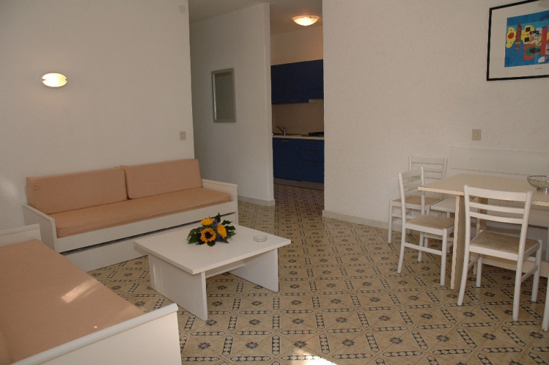 Byt COSTANZA č. 1 – byt v přízemí, obývací pokoj s kuchyňským koutem a rozkládacím lůžkem, ložnice s manželskou postelí a další třílůžková ložnice (samostatné lůžko + palanda) 1 sociální zařízení.