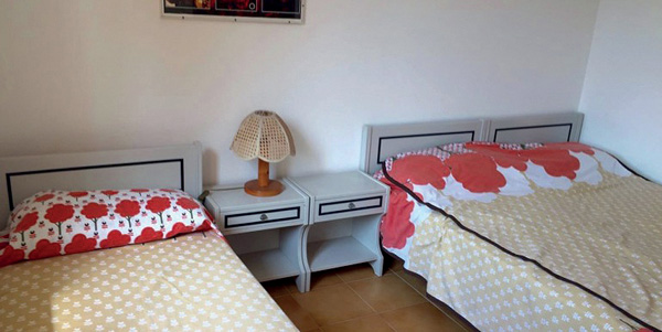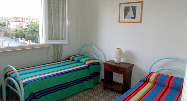 QUADRILO 8 (65 m²) - přízemí: 1 ložnice s manželskou postelí, 1 menší ložnice s palandou rozložitelnou na 2 samostatná lůžka, obývací pokoj s kuchyňským koutem a rozkládacím gaučem pro 2 osoby, sociální zařízení se sprchou, terasa s předzahrádkou; 1. patro: 1 ložnice s manželskou postelí (vstup po úzkém točitém schodišti), sociální zařízení se sprchou, malý balkon.