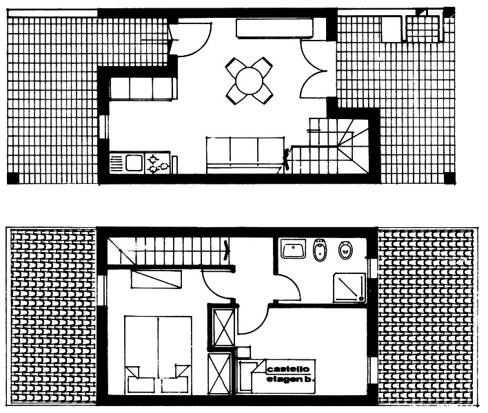 TRILO 7 typ C-7 má složení: v přízemí: obývací pokoj s rozkládacím divanem, kuchyň, terasa se zahradním nábytkem a se zahradním grilem, oplocená zahrada. V 1.patře: 1 ložnice s manželskou postelí, 1 čtyřlůžková ložnice se 2 samostatnými lůžky a palandou, sociální zařízení.