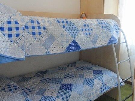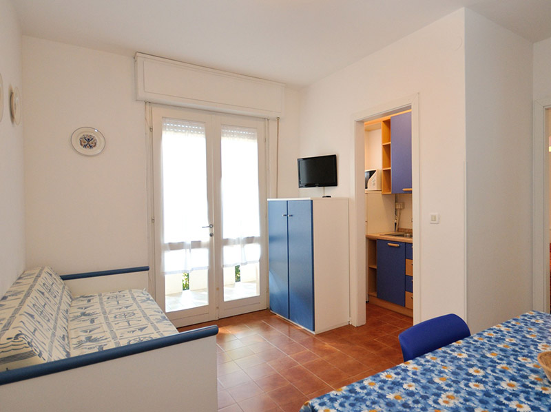 TRILO 5/6: obytná kuchyň s rozkládacím jedno až divanem, manželská ložnice a dvoulůžková ložnice (někdy palandy), balkon (některé byty s částečným výhledem na moře)