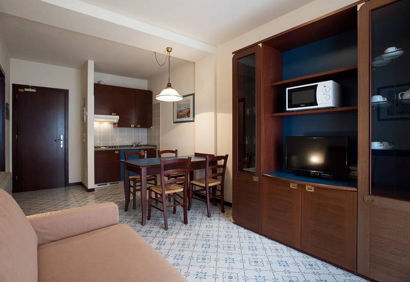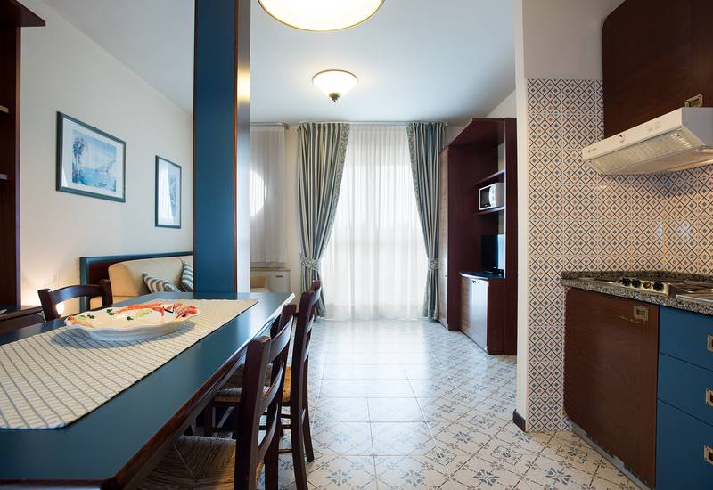 Classic Suite (38 m2) pro 3-4 osoby, který je složen z obývacího pokoje s rozkládacím lůžkem, kuchyňský kout, třílůžkovou ložnicí s manželským a samostatným lůžkem, jedno sociální zařízení se sprchovým koutem, krytá terasa s bočním výhledem na moře.