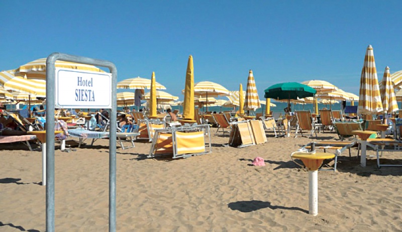 Hotel SIESTA se nachází v bezprostřední blízkosti pláže, v klidné části na konci promenády, ale zároveň v pohodlné pěší vzdálenosti (500 m) od centra. Hotel nabízí prostředí vhodné pro rodiny s dětmi (bazén, zahrada s dětským hřištěm). K dispozici jsou nově vybavené hotelové pokoje pro 2-4 osoby vybavené vlastním sociálním zařízením (rozměrově menší se starším vybavením), fénem, telefonem, TV-sat, trezorem, klimatizací a WiFi, balkon. Čtyřlůžkové pokoje mají 4. lůžko na palandě. Parking je zdarma, ale jen omezené množství parkovacích míst do vyčerpání. Další parkovací místa v blízkosti. Dále hotel nabízí zapůjčení kol. Sousedí s hotelem LA FENICE, kam hosté z hotelu SIESTA docházejí do restaurace na večeře.