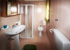 TRILO 6 má složení: 2 třílůžkové ložnice (1 manželské + 1 samostatné lůžko), obývací pokoj s kuchyňským koutem, sociální zařízení se sprchou, předzahrádka nebo balkon