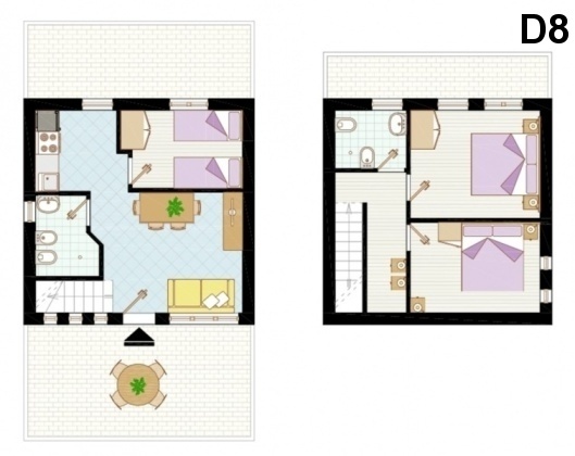 byt QUADRILO 8 má složení: v přízemí terasa, předzahrádka, obytná kuchyň s rozkládacím dvoudivanem, 1 ložnice se dvěma samostatnými lůžky a sociální zařízení. V 1.patře 1 ložnice s manželskou postelí, 1 ložnice se dvěma samostatnými lůžky, druhé sociální zařízení, balkon.