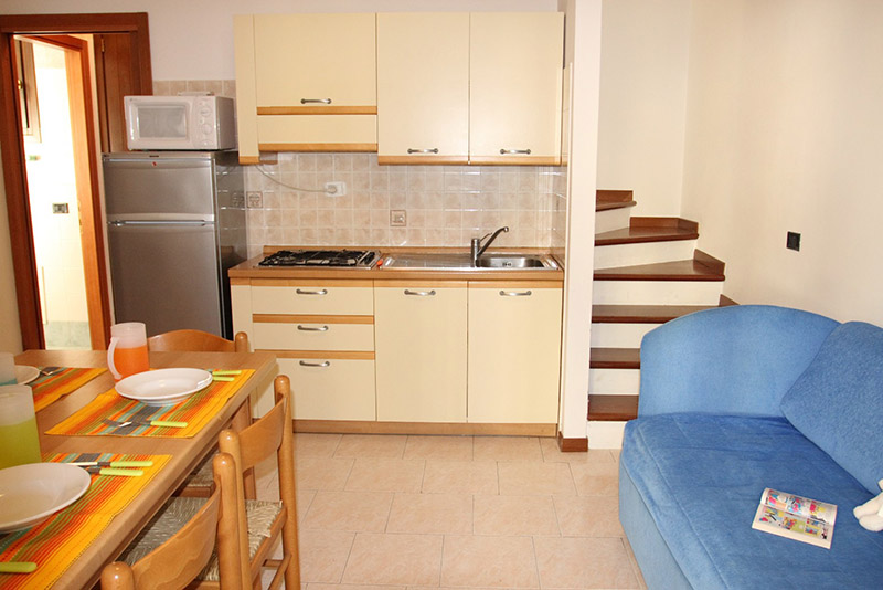QUADRILO 8: mezonetový dvoupodlažní byt s vnitřním schodištěm, přízemí a 1. patro, balkon a terasa s předzahrádkou, obývací pokoj s rozkládacím divanem, třílůžková ložnice (manželské lůžko a samostatné lůžko), dvoulůžková manželská ložnice, jednolůžková ložnice.