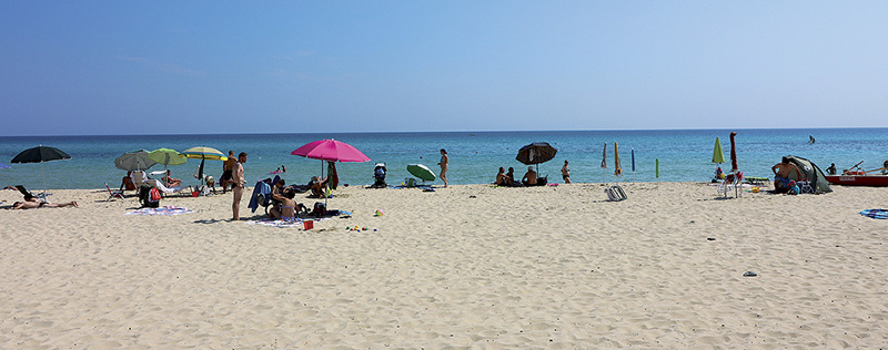 20 m, písčitá s pozvolným sestupem do moře, volná i organizovaná se slunečníky a lehátky. Plážový servis za poplatek.